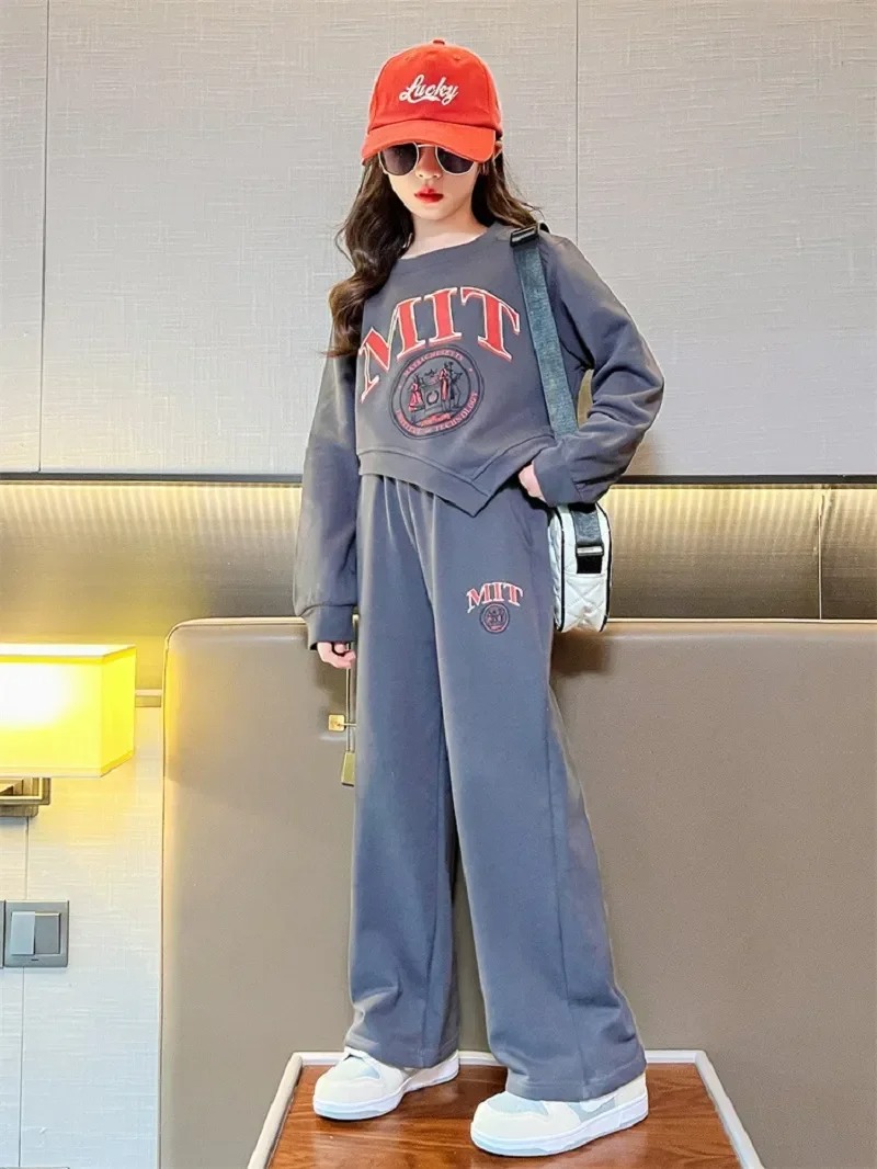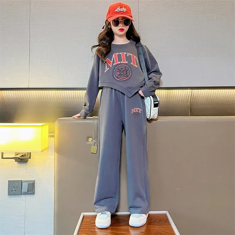 طقم بناتي مرّة كاجوال وعملي لربيع وخريف، يجي ببلوزة قصيرة بتصميم غير منتظم وتطريز أبجدية يعطي ستايل عصري. ومعاه بنطلون رياضي واسع ومريح، مناسب للمدرسة، الطلعات أو الرياضة. شكله مرتب ويعطي البنت لوك شبابي ولطيف.