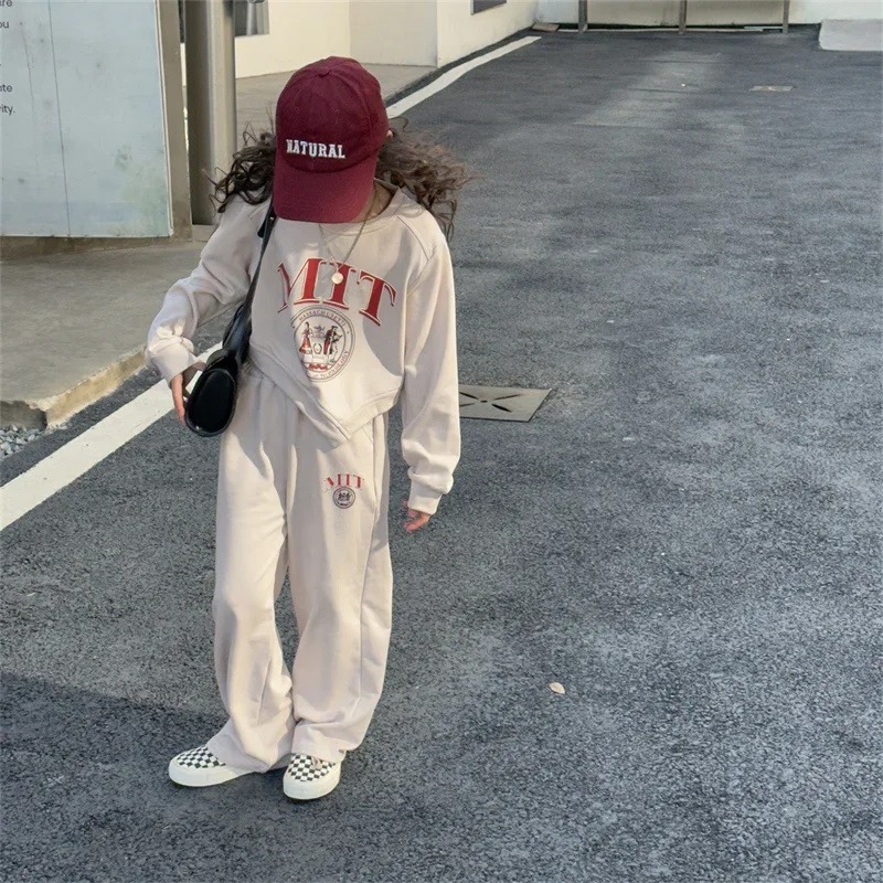 طقم بناتي مرّة كاجوال وعملي لربيع وخريف، يجي ببلوزة قصيرة بتصميم غير منتظم وتطريز أبجدية يعطي ستايل عصري. ومعاه بنطلون رياضي واسع ومريح، مناسب للمدرسة، الطلعات أو الرياضة. شكله مرتب ويعطي البنت لوك شبابي ولطيف.